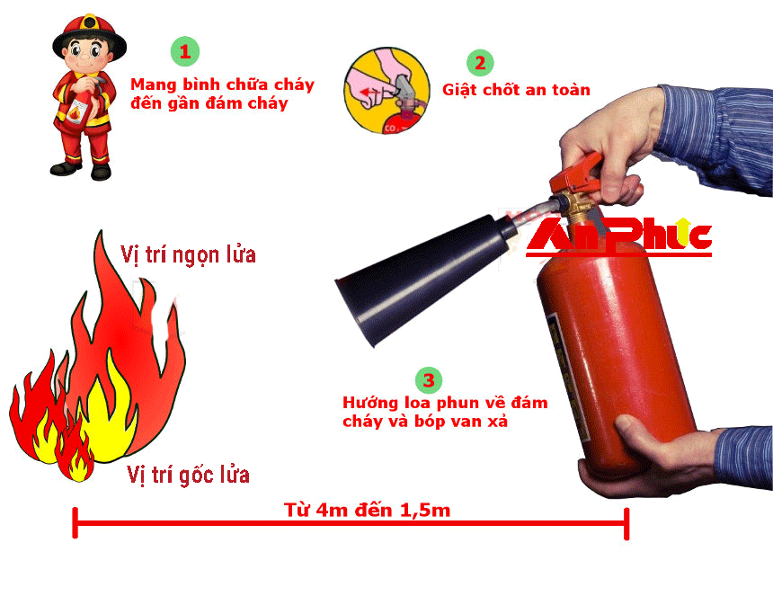 Khi phát hiện ra cháy, nhanh chóng di chuyển bình tới gần điểm cháy, giật chốt hãm, hướng vòi phun vào càng gần gốc lửa càng tốt.