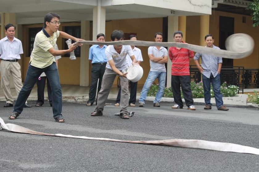 Bước 1: Nhanh chóng mang cuộn dây vòi cứu hỏa từ hộp ra sân.
